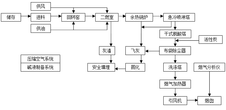 焚燒采用回轉(zhuǎn)窯+二燃室工藝,煙氣凈化采用急冷塔+脫酸塔+布袋除塵器工藝,配置先進的自動控制系統(tǒng),焚燒煙氣達標排放,殘渣進入安全填埋場,飛灰進入固化車間固化后填埋。醫(yī)療廢物進行全過程管理,設置冷藏庫和周轉(zhuǎn)箱消毒系統(tǒng),醫(yī)療廢物則通過進料機構(gòu)進入焚燒系統(tǒng)處理。
