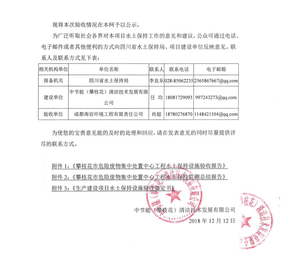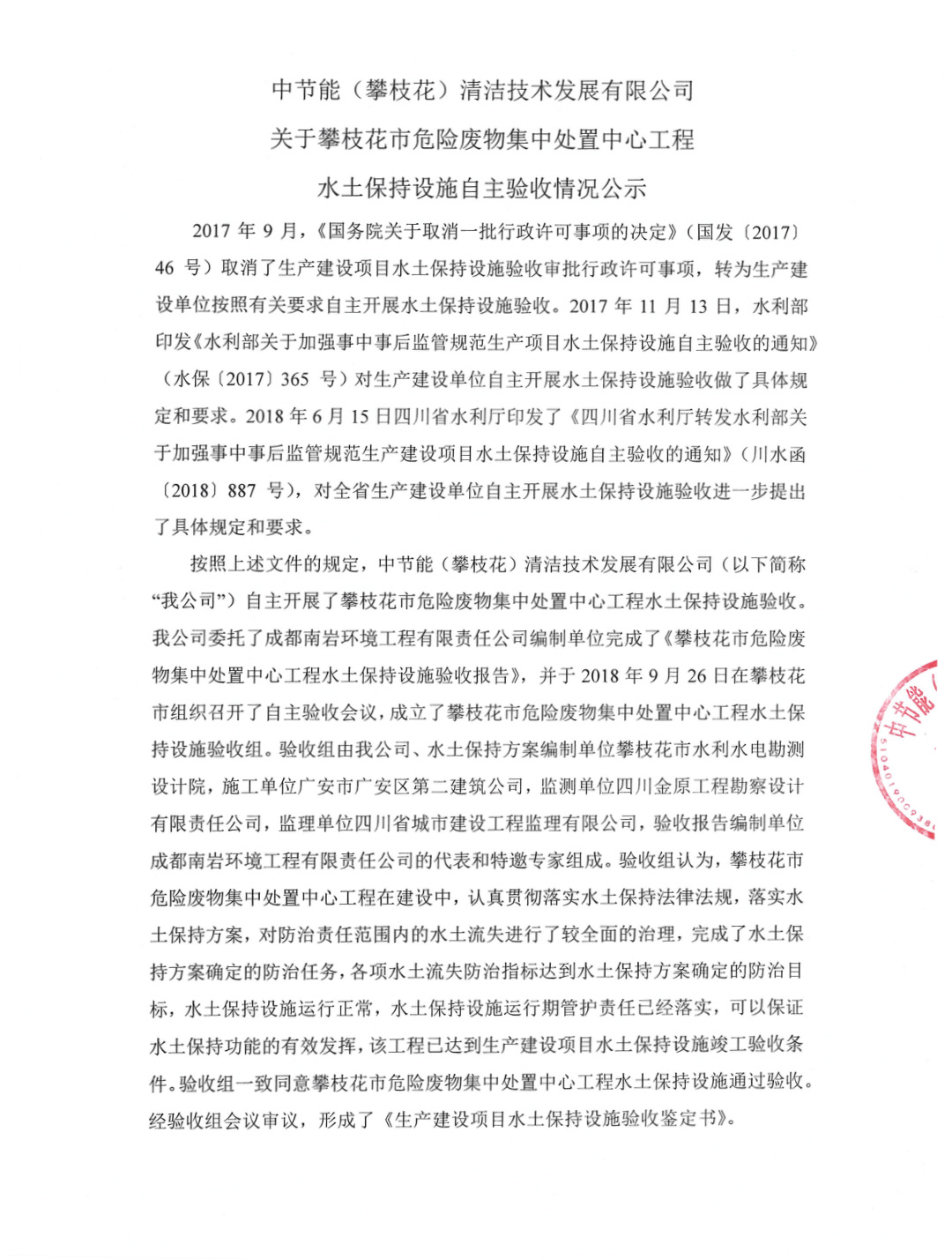 攀枝花市危險(xiǎn)廢物集中處置中心工程水土保持設(shè)施自主驗(yàn)收情況公示